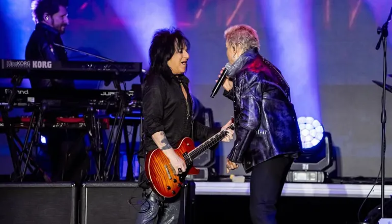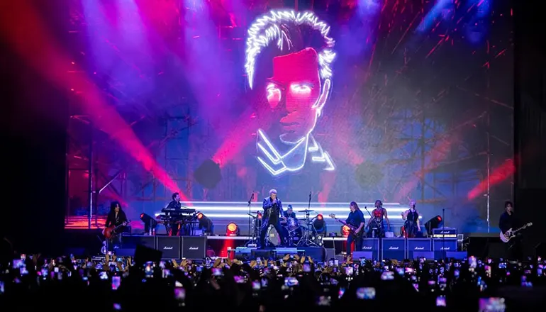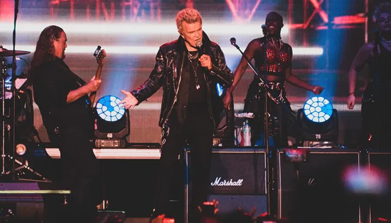 El show comenzó con un mensaje autobiográfico a través de “Still Dancing”, una declaración abierta sobre su vida, su lucha y su permanencia en la música. Sin descanso, Idol encadenó éxitos como “Cradle of Love” y “Flesh for Fantasy”, haciendo estallar al público desde el arranque. La noche también tuvo momentos emotivos, especialmente con “Eyes Without a Face”, que transformó el recinto en un mar de luces blancas y voces al unísono.