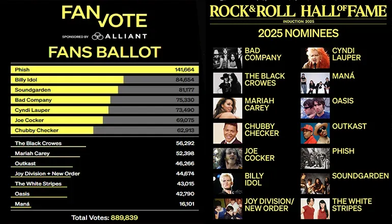 De los 2.553.233 votos totales que se emitieron entre el 12 de febrero y el 27 de abril en la votación de los fanáticos para el Salón de la Fama del Rock and Roll de 2025, así es como se desglosó el recuento final: