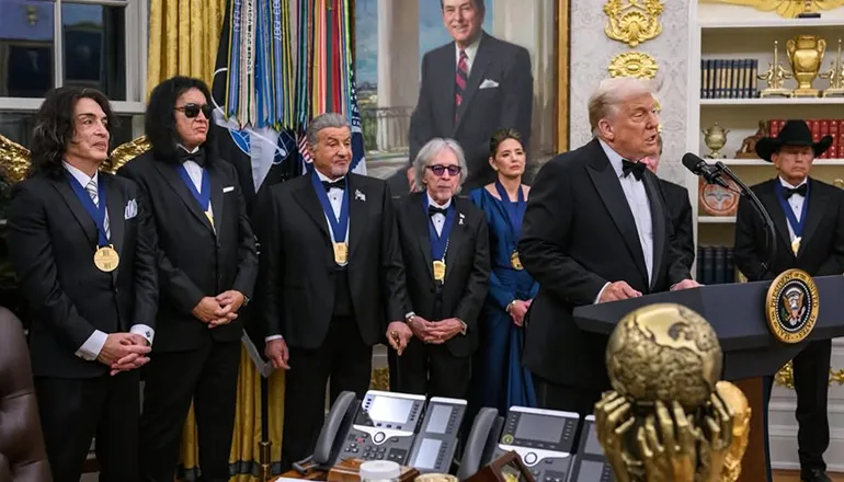 Donald Trump recibió a los miembros de KISS en el Despacho Oval para entregarles medallas de honor y reconocer su trayectoria. Durante la ceremonia, el presidente describió al grupo como una “banda increíble de rock”, destacando su impacto cultural y su legado dentro del género. Gene Simmons, Paul Stanley y Peter Criss estuvieron presentes para recibir el homenaje presidencial.