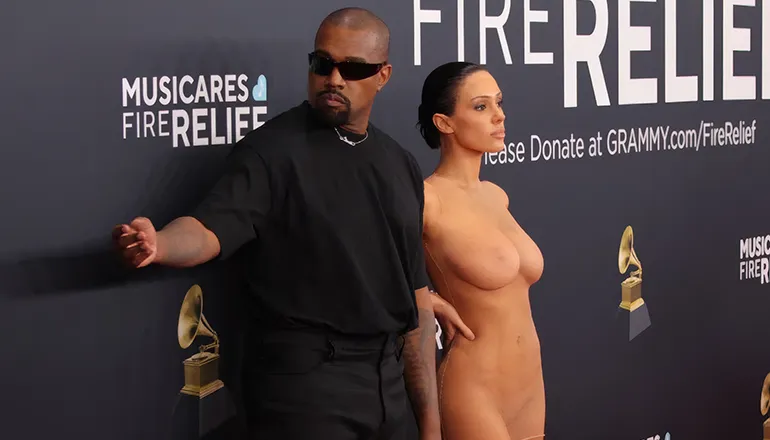 Ambos llegaron a la alfombra roja luciendo atuendos a juego en color negro: Kanye con una camiseta, pantalones oscuros y lentes de sol, mientras que Bianca llevaba un elegante abrigo, que rápidamente se quitó para mostrar un vestido transparente que la dejó casi desnuda ante las cámaras y los presentes. La provocativa pose de Censori, primero de espaldas junto a su esposo y luego de frente, acaparó la atención de todos.