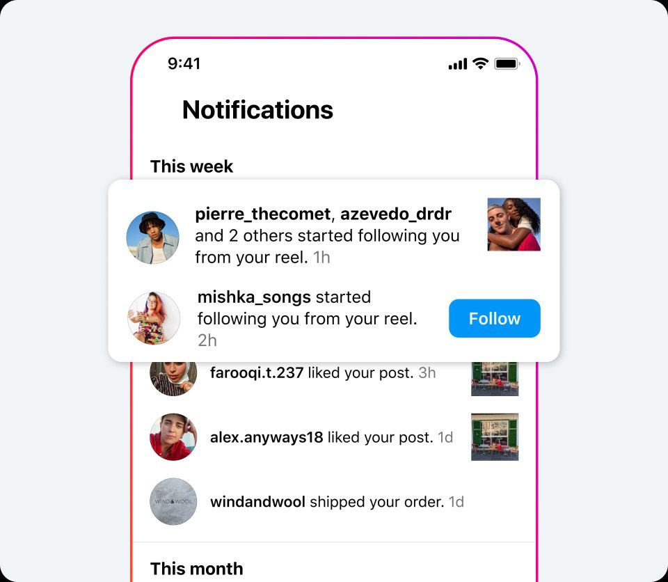 La red social también ha introducido un sistema de notificaciones que alerta a los usuarios de nuevos seguidores que les hayan comenzado a seguir a raíz de visualizar sus propios Reels.