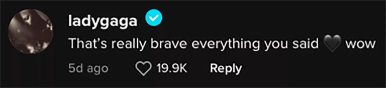 El vídeo, que fue compartido por una cuenta de admiradores de la cantante de Midnights, fue subtitulado: «Esta escena siempre me rompe el corazón 💔». En respuesta, Gaga comentó: «Eso es realmente valiente todo lo que dijiste 🖤 wow».