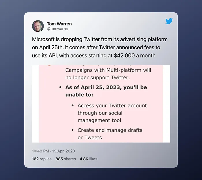 Hace unos días se anunció que Microsoft retiraría a Twitter de su plataforma de publicidad el próximo 25 de abril. Esto viene en respuesta al cambio que realizó Twitter en el acceso a su API con el que pretendía cobrarle 42.000 dólares a las empresas que quisieran acceder a ella.