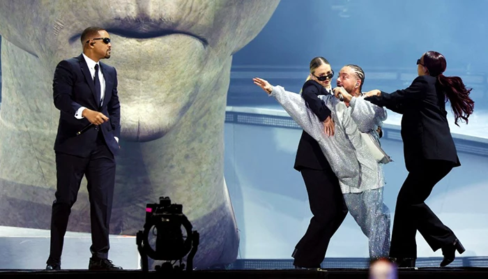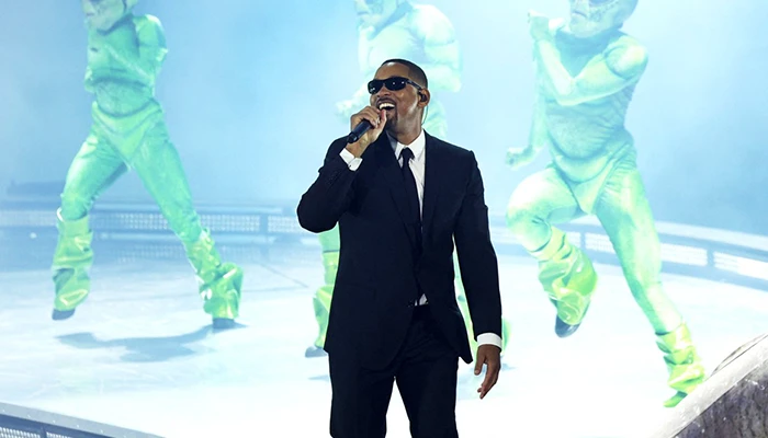 Smith irrumpió en el escenario disfrazado como el agente J, su icónico personaje de la exitosa saga «Hombres de negro», para interpretar el tema de la primera entrega, lanzada en 1997.